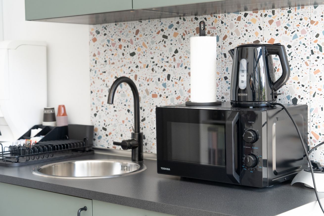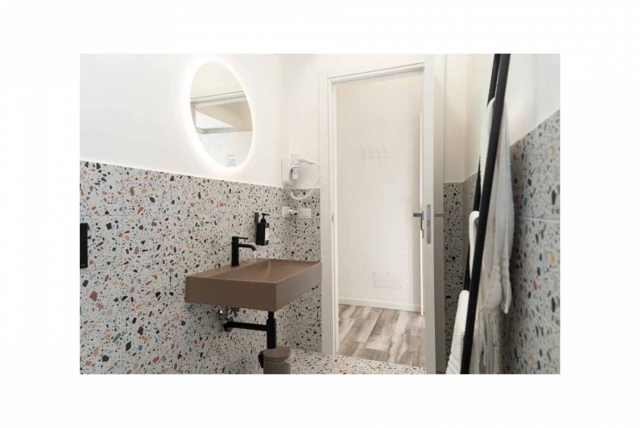 Stanza dotata di: ampio letto matrimoniale, televisore Smart, scrivania per PC, set di cortesia, cassaforte, armadio, frigorifero, aria condizionata e bagno privato con doccia, bidet ed asciugacapelli. All'esterno della stanza presenta una "cucina" condivisa con le altre 3 stanze dotata di macchina del caffè multifunzione, bollitore e forno a microonde.