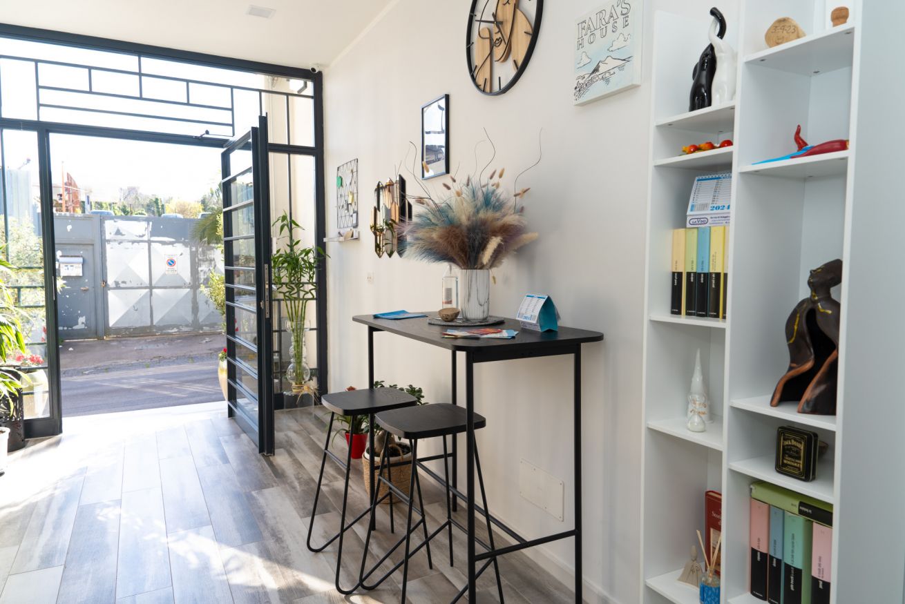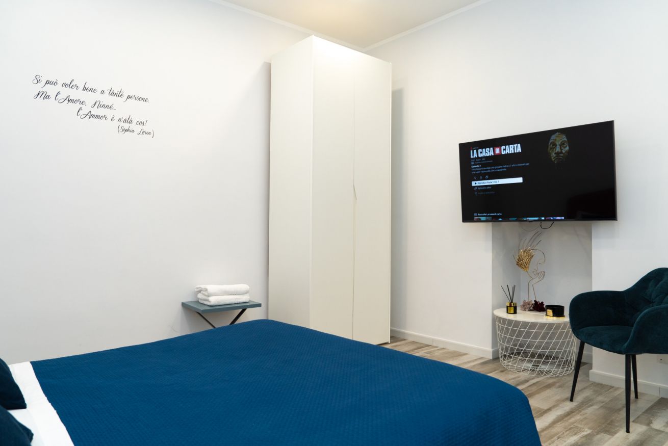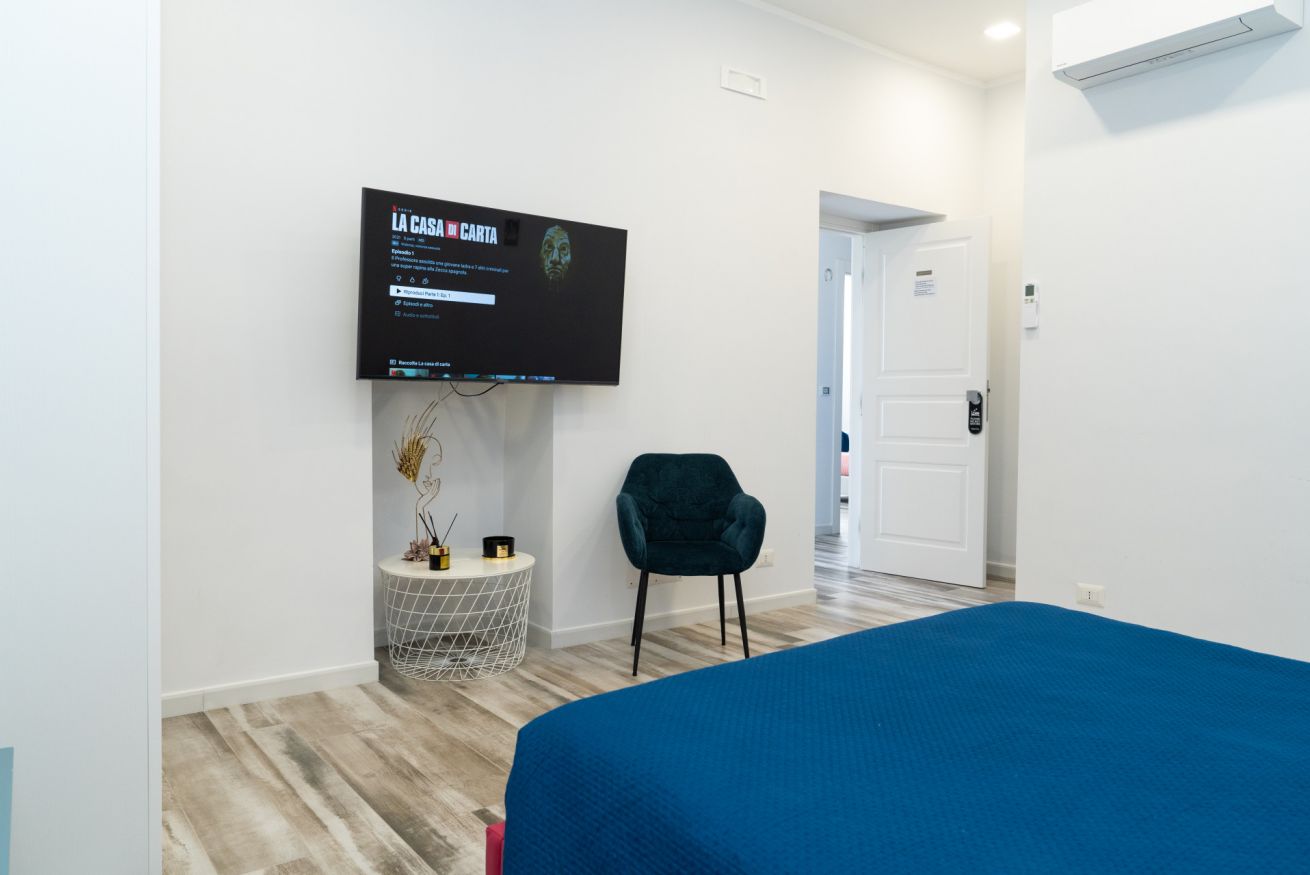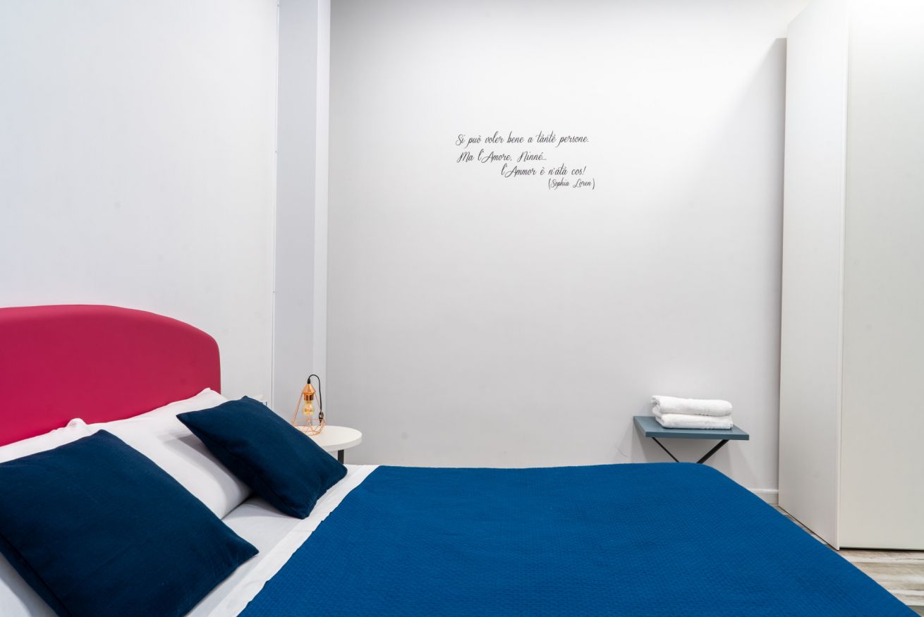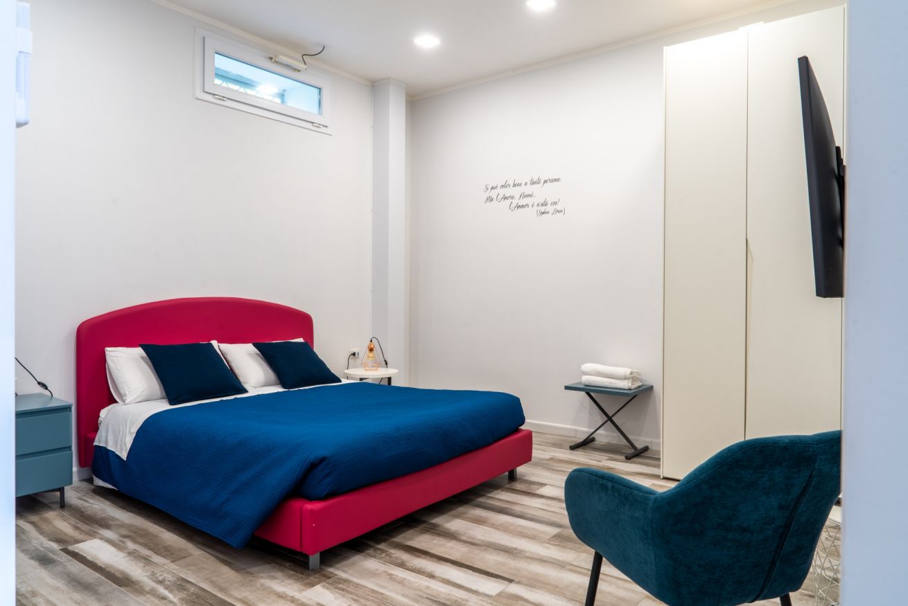 La nostra stanza matrimoniale più "romantica". Spaziosa e confortevole. Collocata alle spalle della struttura, quindi lontana dai rumori della strada. Essa è dotata di: ampio letto matrimoniale, scrivania per PC, televisore Smart 50 pollici, set di cortesia, cassaforte, armadio, frigorifero, aria condizionata e bagno privato con doccia, bidet ed asciugacapelli. All'esterno della stanza presenta una "cucina" condivisa con le altre 3 stanze dotata di macchina del caffè multifunzione, bollitore e forno a microonde.